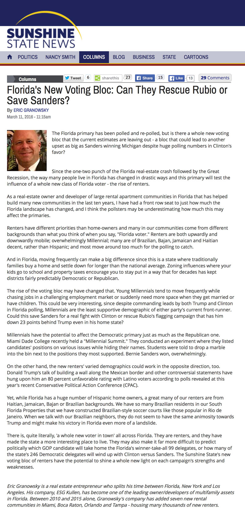 Op-Ed | Florida’s New Voting Bloc: Can They Rescue Rubio or Save Sanders? by admin | Apr 16, 2016 | Press | 0 comments http://www.sunshinestatenews.com/story/floridas-new-voting-bloc-can-they-rescue-rubio-or-save-sanders Submit a Comment Cancel replyYour email address will not be published. Required fields are marked *Comment * Name * Email * Website Save my name, email, and website in this browser for the next time I comment. Δ
